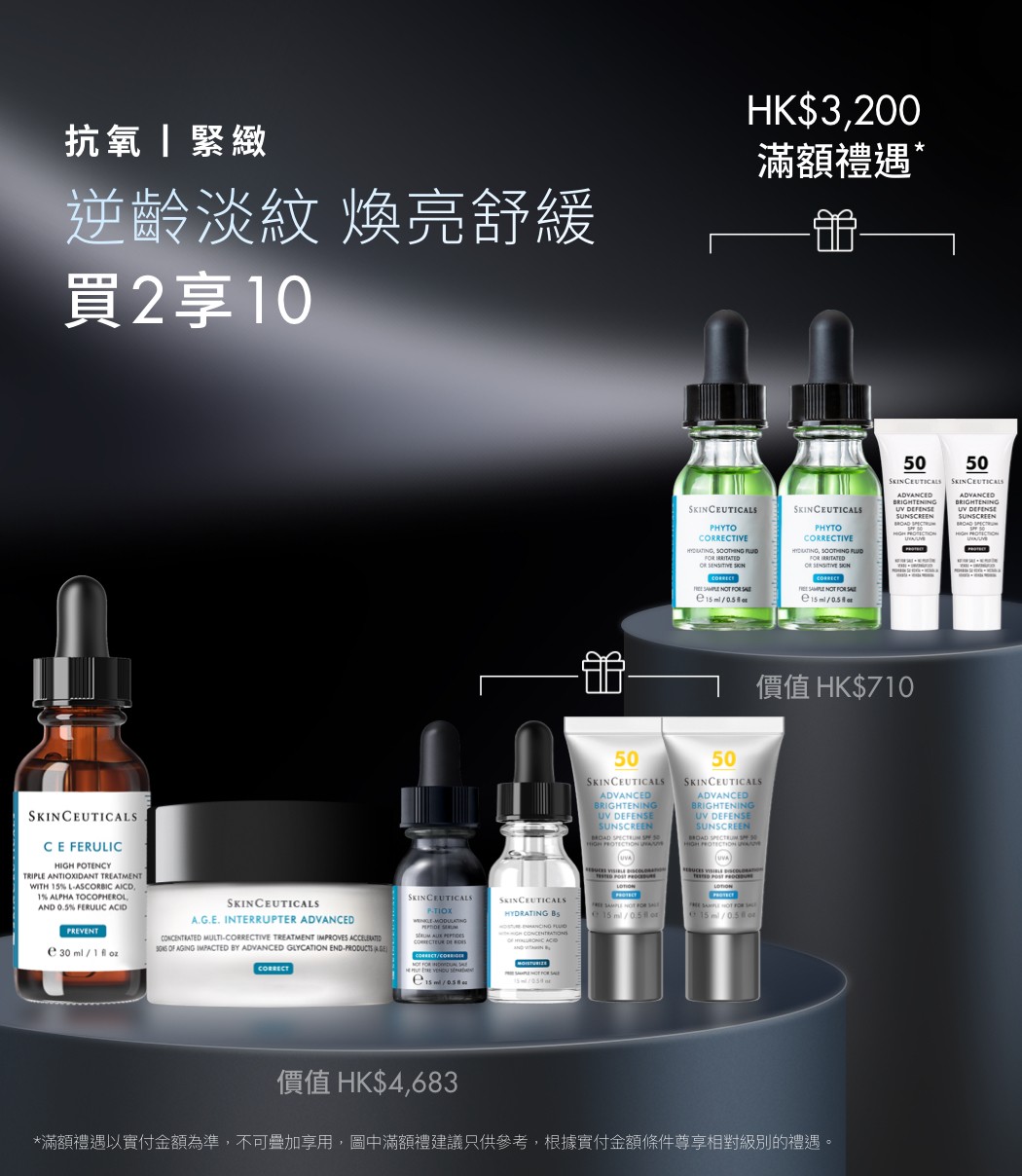 抗氧抗醣緊緻套裝含濃縮維他命C E FERULIC精華30ml及抗醣活膚緊緻霜48ml,禮贈胜肽抗皺精華15ml、水合維他命B5精華15ml及雙效淡斑防曬霜15ml*2。